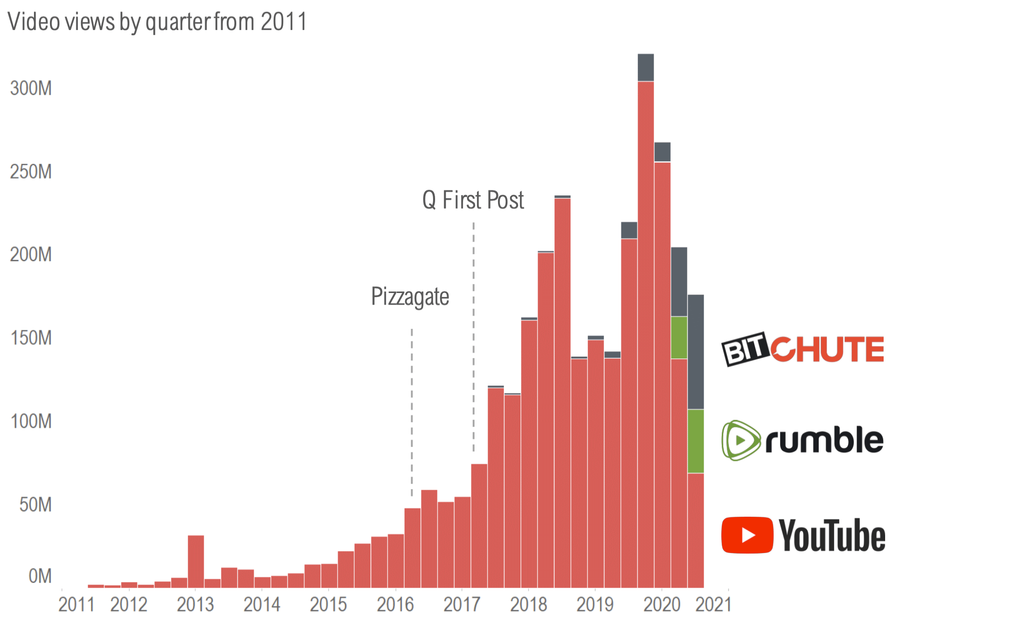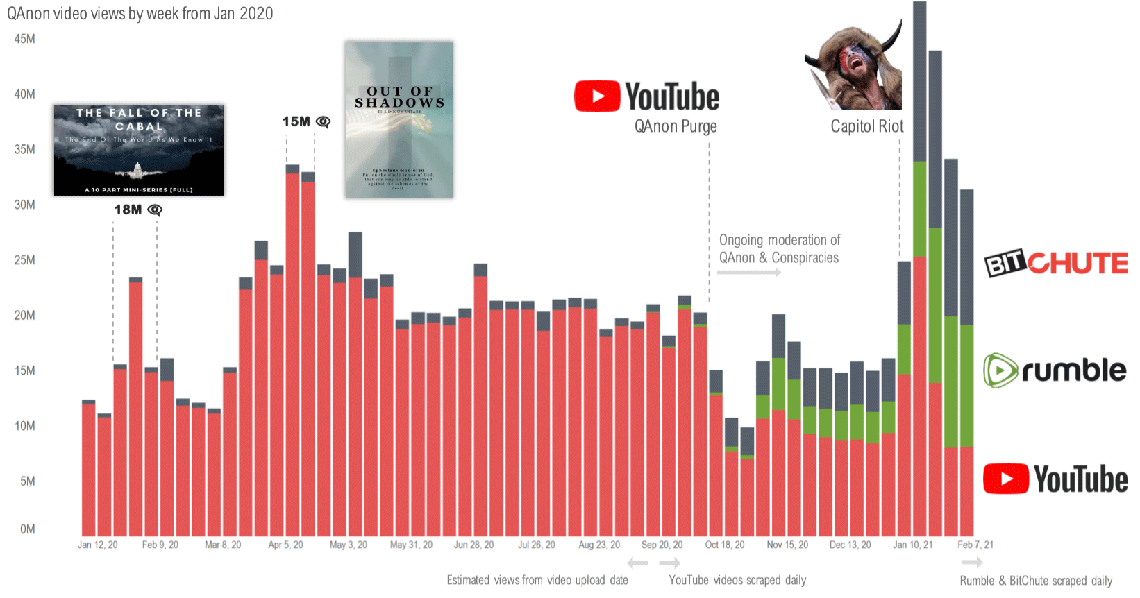 In October, following bans by Twitter and FB of QAnon content, YouTube cracked down QAnon content as well. Channels received 2.7M daily views for the 30 days preceding the Oct 2020 crackdown and dropped to 1.3M after - about half. However, this crackdown resulted in a significant number of QAnon followers shifting to Bitchute and Rumble during this period and by Dec 2020 QAnon channels were back up to receiving 2.2M views daily.