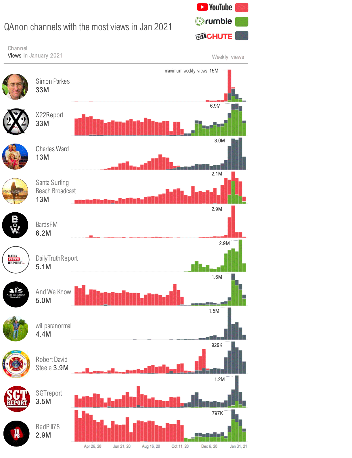The decentralized nature and the migration of QAnon video consumers from YouTube to BitChute and Rumble has created a variety of winners and losers. This can be seen in the chart below where four out of the top 10 most viewed channels in January 2021 had a negligible following prior to October 2020.